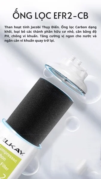 Ống lọc Carbon dạng khối, loại bỏ các thành phần hữu cơ nhỏ, cân bằng độ PH, chống vi khuẩn. Tăng cường vị ngon cho nước và ngăn cản vi khuẩn quay trở lại.